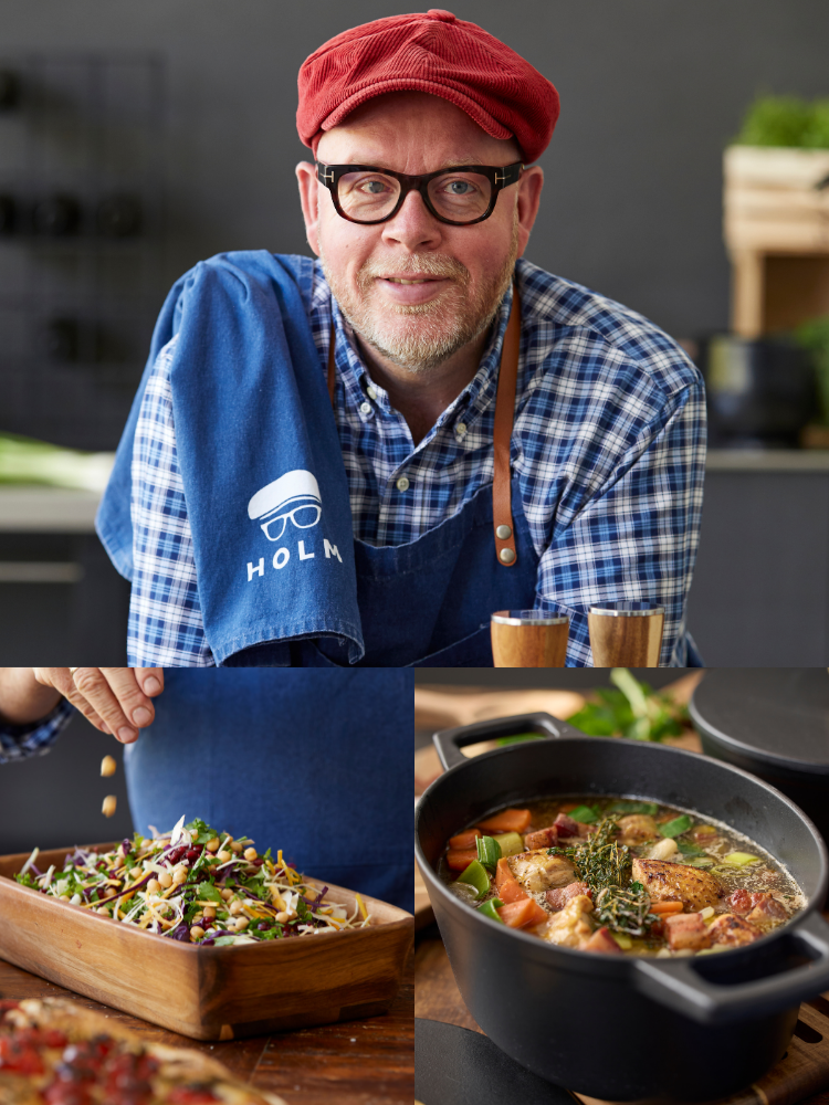 Claus Holm samarbejder med Coop om at sætte det gode måltid og de gode valg på dagsordenen. Som Coops huskok udvikler han opskrifter på nem og velsmagende mad, og derfor finder du også Claus Holms produkter under brandet HOLMs deli i Coops butikker. Det er ligesom HOLM-produkterne lækkert og gedigent kvalitetsgrej, der er udviklet, testet og godkendt af Claus Holm selv.